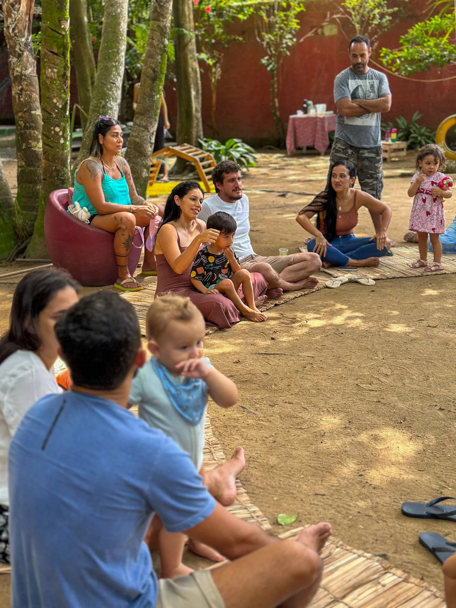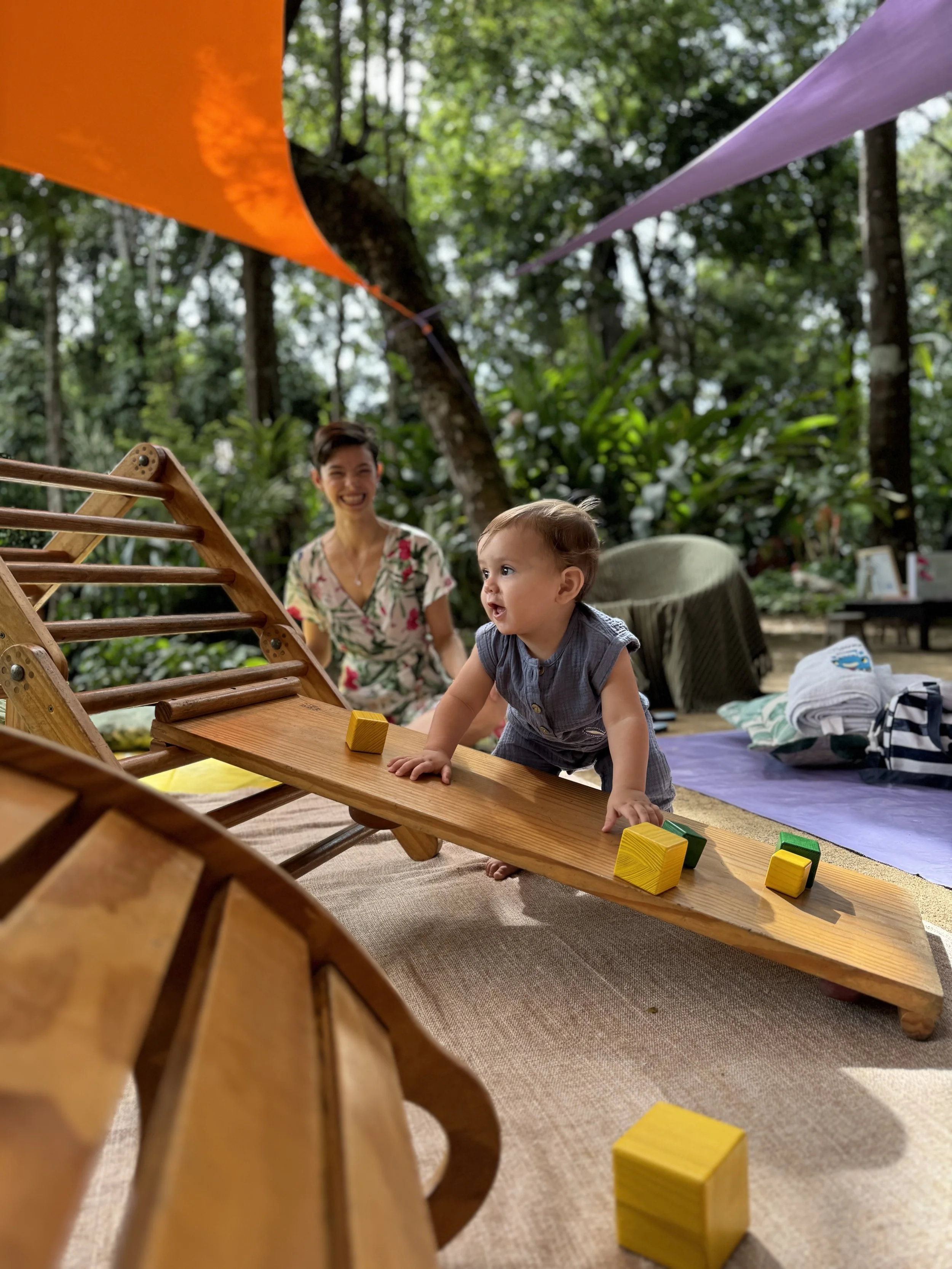 As famílias são recebidas em um ambiente carinhosamente preparado em um jardim encantado, no meio das árvores nativas da Mata Atlântica.